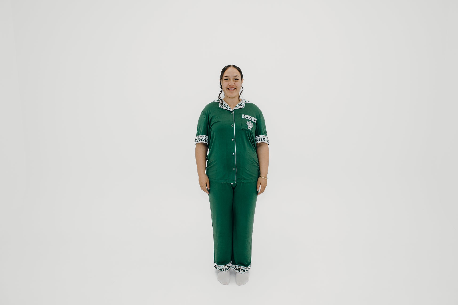 Whether you are new to our bamboo collection you will soon discover why this beautiful womens PJ set is a summer staple. Made from our signature soft fabric, in a kakariki tone, this short sleeve shirt and straight leg pant combo is designed to ensure you remain in ultimate comfort through the summer months.