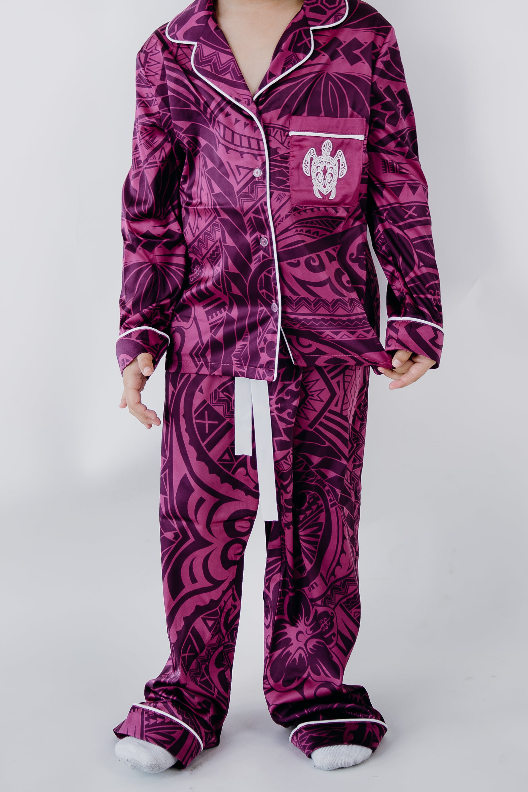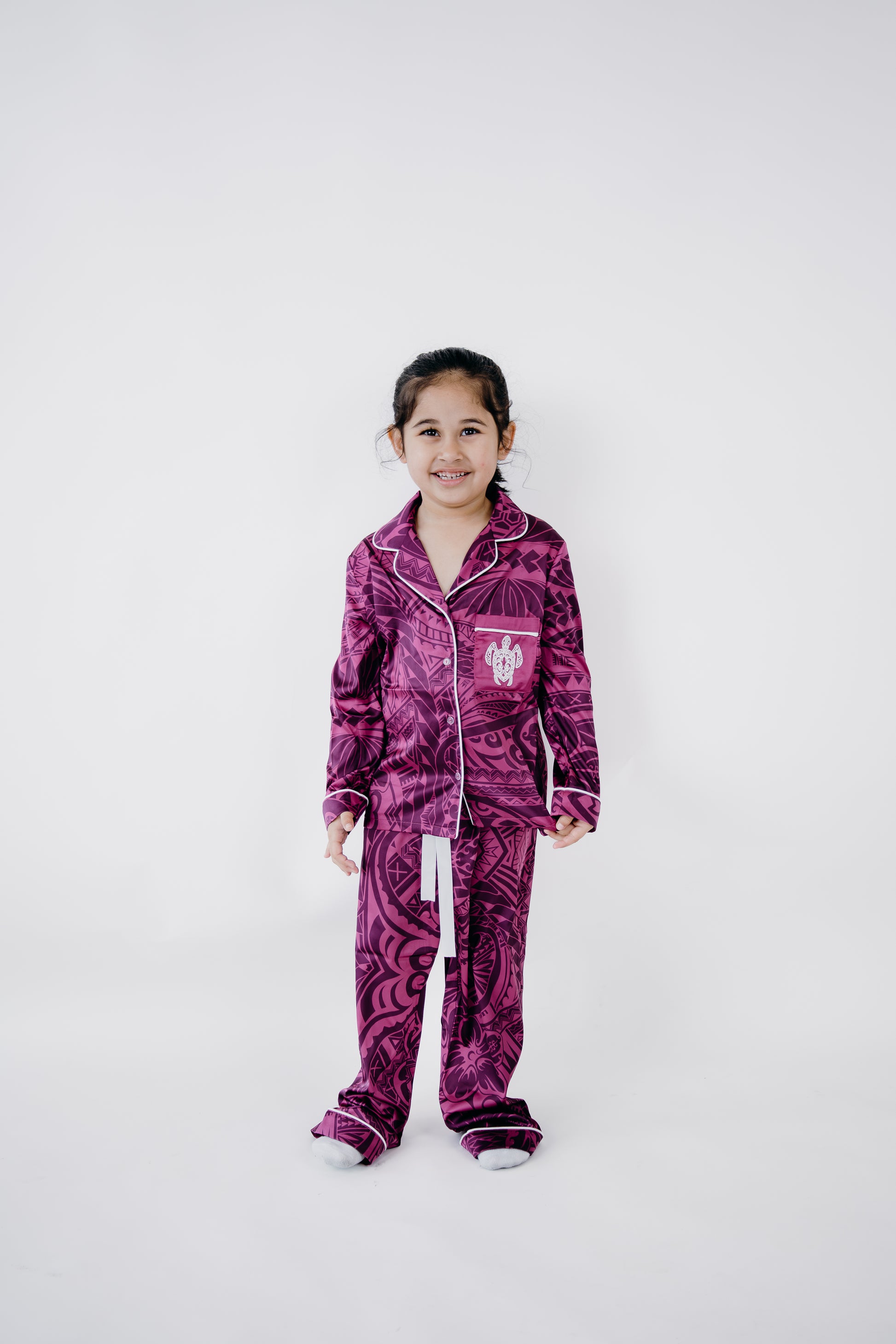 Experience luxurious comfort with our purple potion culture satin girl long sleeve pj set. Crafted from smooth, lightweight satin, this set offers a silky feel that enhances relaxation and sleep quality.